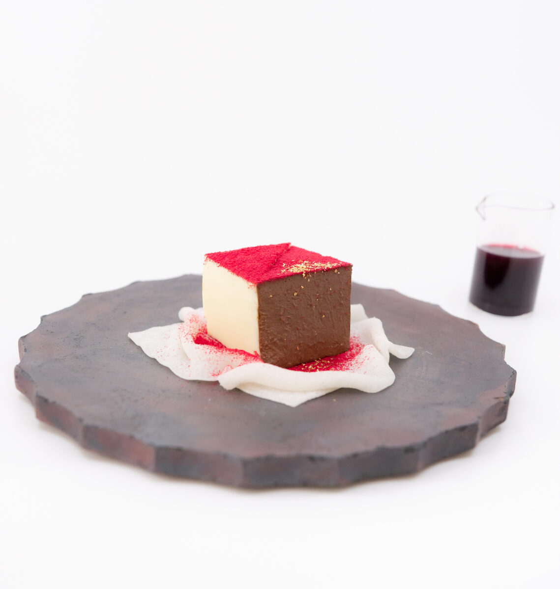 白餡と合わせたダークチョコレートとホワイトチョコレートのテリーヌを求肥のクレープにのせて、ラズベリーパウダーをふりかけた創作スイーツ。